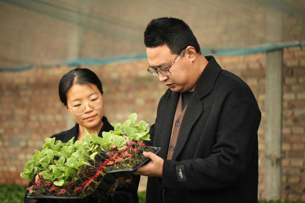 2月9日,張莎莎、王學(xué)猛在育苗溫室里觀察苗情。(受訪者供圖)