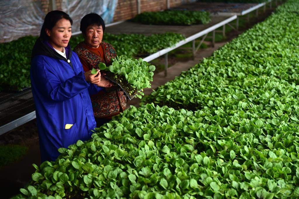2月6日,張莎莎(左)在育苗溫室里觀察苗情。新華社記者王民 攝