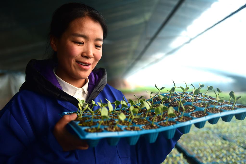 2月6日,張莎莎在育苗溫室里觀察苗情。新華社記者王民 攝