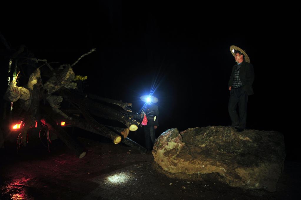 龍革雄在雨夜中準(zhǔn)備搬運(yùn)樹苗(2014年2月21日攝)。