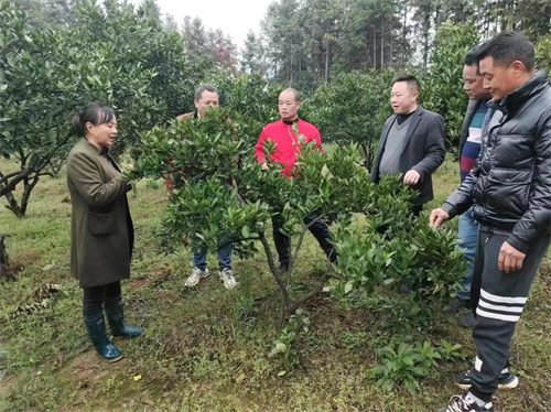 蔣清金(左三)帶領(lǐng)村“兩委”到村集體經(jīng)濟(jì)臍橙園了解臍橙長(zhǎng)勢(shì)