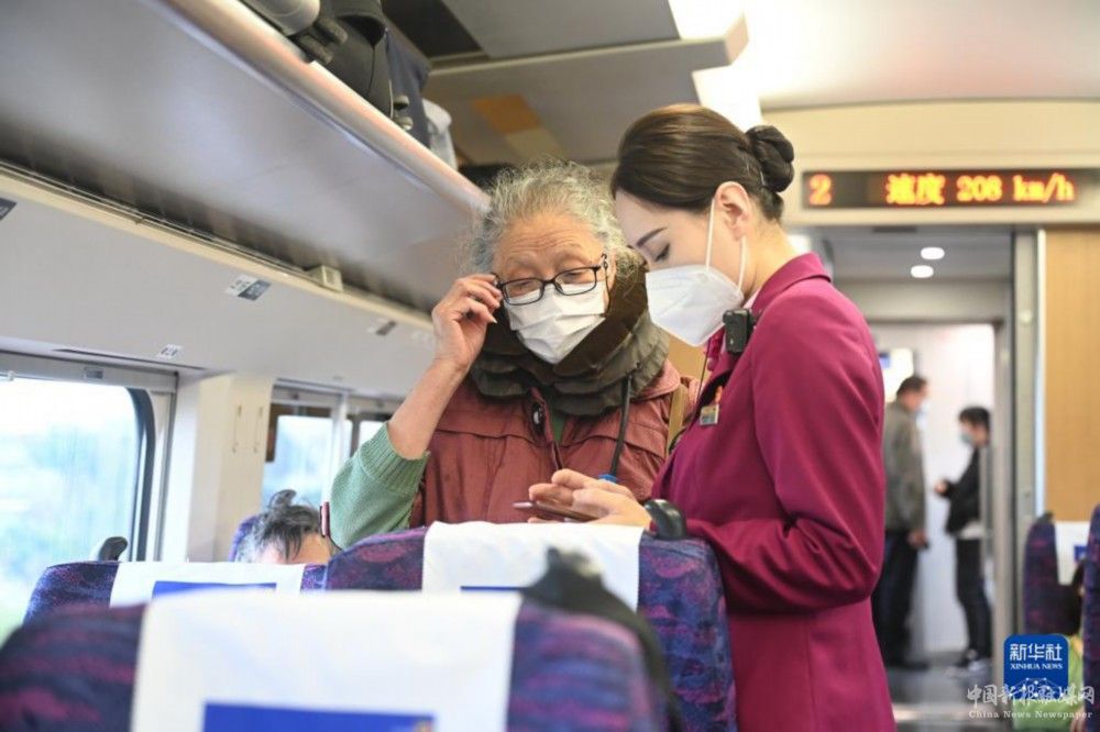 4月1日,中國鐵路南昌局集團(tuán)有限公司福州客運段乘務(wù)員杜淼(右)在核對赴港旅客信息。新華社記者林善傳攝