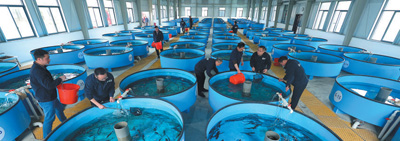 工作人員在長江珍稀魚類培育基地宜昌實驗站苗種培育間轉(zhuǎn)運放流中華鱘幼魚。