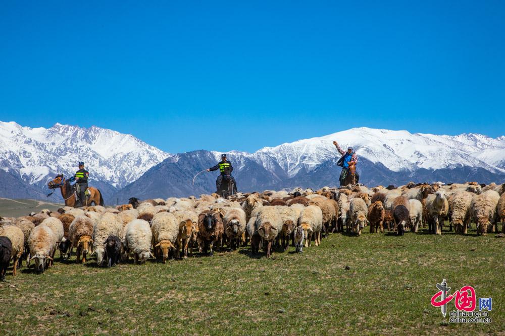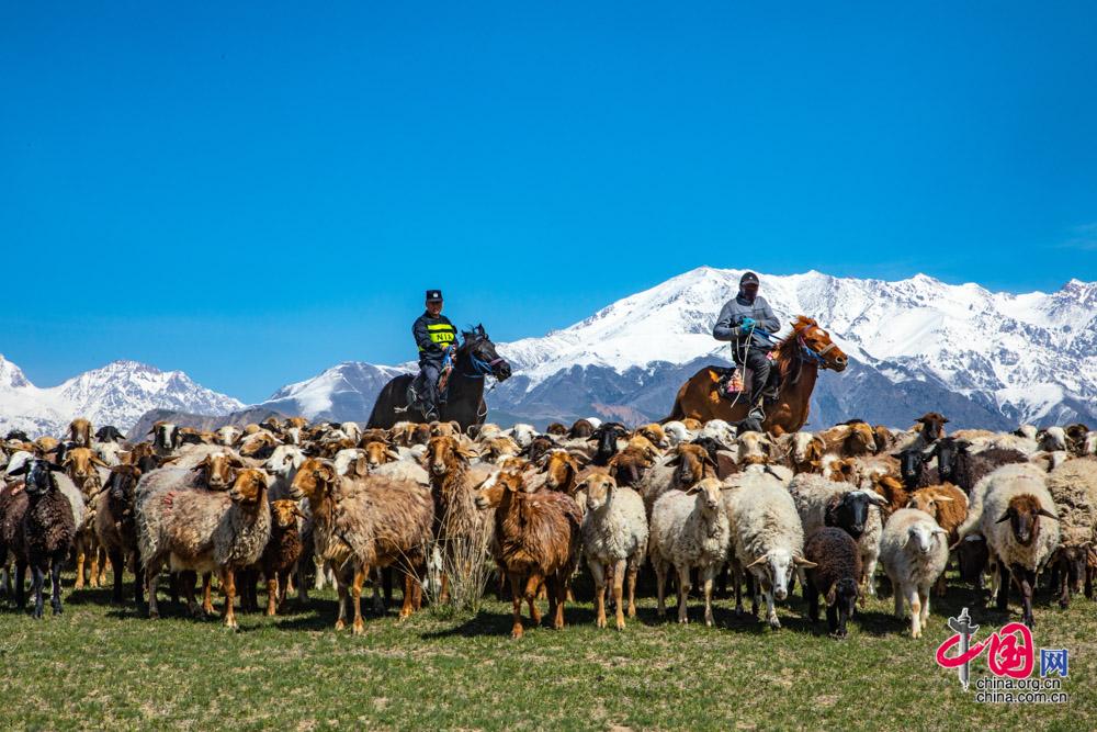 中國網(wǎng)訊(記者 趙娜 通訊員 王鵬飛、鄭明明、周航生)進入四月份,隨著氣溫逐漸升高,新疆伊犁邊境高海拔地區(qū)冰雪融化、草場逐步返青,生活在當(dāng)?shù)氐哪撩耜懤m(xù)開啟了一年一度的春季轉(zhuǎn)場,成千上萬只牲畜從烏拉海溝陸續(xù)遷徙至水草充沛的呼爾賽春草場。為守護牧民,幫助牧民順利安全將牧畜轉(zhuǎn)場,2023年4月23日,3名由新疆伊犁邊境管理支隊紅卡子邊境派出所民(輔)警組織成立“馬背上的護牧隊”,攜帶食物、日常使用藥品等物資,認真勘察轉(zhuǎn)場路線,隨時關(guān)注天氣變化,維護秩序,解決轉(zhuǎn)場途中遇到的困難,全程跟進護送20余公里,直到牧民及羊群全部安全到達牧場。