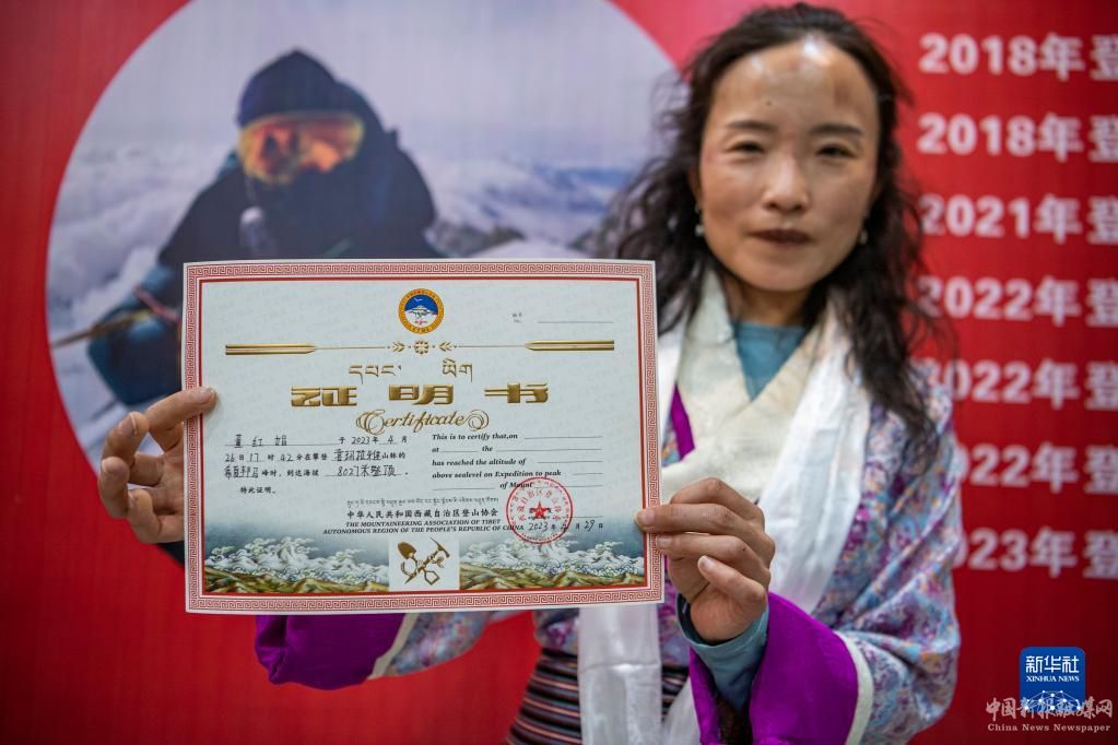 董紅娟向記者展示希夏邦馬峰登頂證書(shū)(4月29日攝)。新華社記者 孫非 攝
