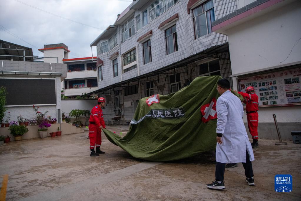 5月3日,應(yīng)急救援人員在云南省保山市隆陽(yáng)區(qū)瓦窯鎮(zhèn)中心衛(wèi)生院搭建帳篷。