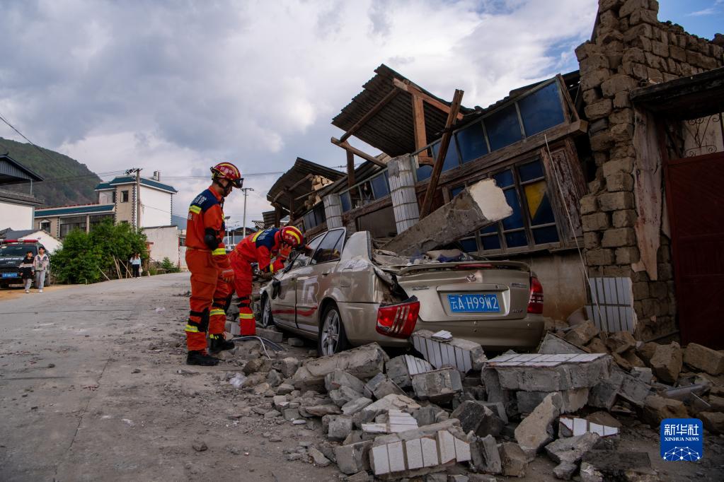 5月3日,應(yīng)急救援人員在云南省保山市隆陽(yáng)區(qū)瓦窯鎮(zhèn)排查受損的房屋和車(chē)輛。
