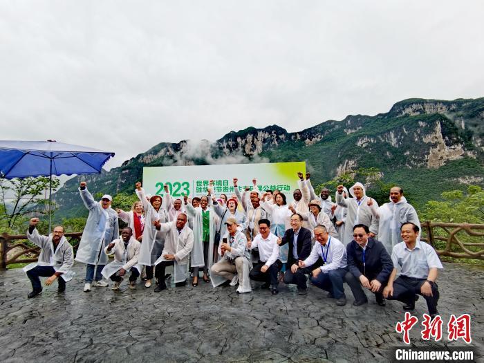 6月5日,駐華使節(jié)參訪團(tuán)在畢節(jié)市化屋村參加貴州生態(tài)環(huán)保公益行動(dòng)合影?!≈行律缬浾?周燕玲 攝