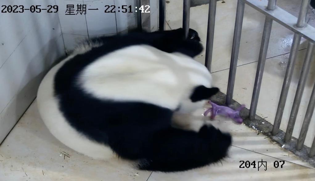 5月29日,在中國大熊貓保護研究中心臥龍神樹坪基地,大熊貓“鑫鑫”誕下幼崽(視頻截圖)。