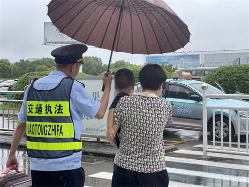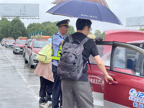 如遇到特殊乘客打車不便時,執(zhí)法人員立刻到指定通道幫忙其打車,其乘客表示,執(zhí)法人員身上那抹耀眼的‘執(zhí)法藍’就是這綿綿雨季的溫暖光。