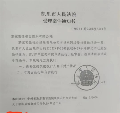終審判決后,被告楊東未執(zhí)行法院判決。為此,黔東南微視向凱里市人民法院遞交了強制執(zhí)行申請書,截止發(fā)稿前,凱里市人民法院已受理了該申請。(記者 羅茜)