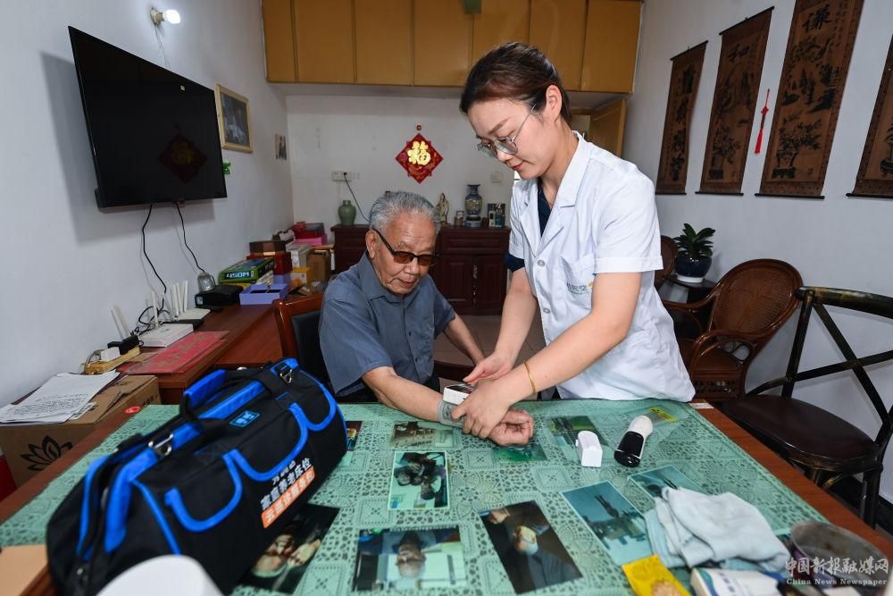 家庭醫(yī)生上門為住在浙江省嘉興市秀洲區(qū)新塍鎮(zhèn)蓬萊社區(qū)的83歲獨(dú)居老人孫志龍測(cè)量血壓(2023年6月15日攝)。新華社記者 徐昱 攝