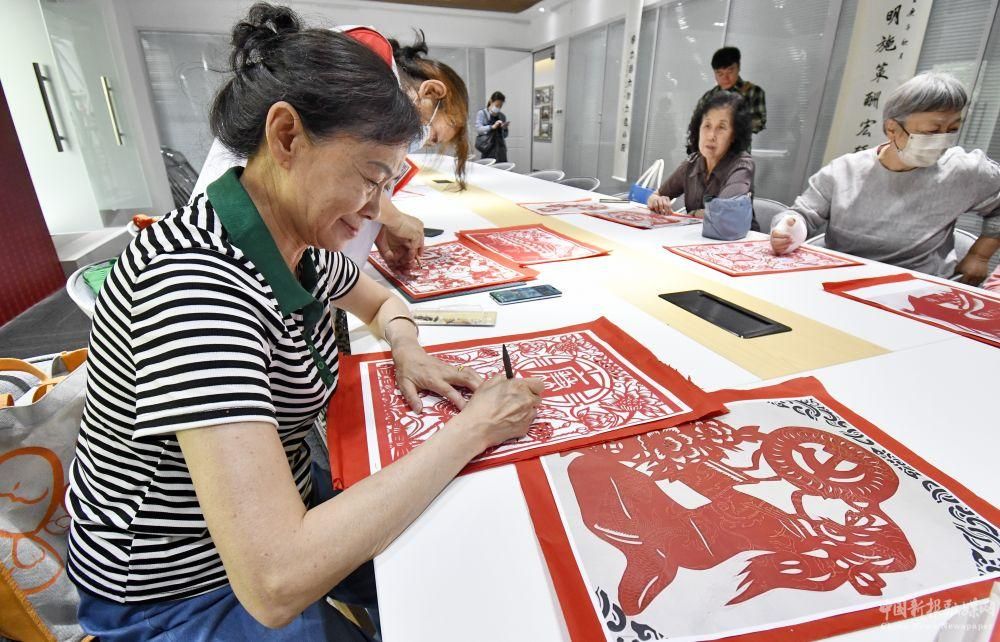北京朝陽無限社區(qū)的老年人在社區(qū)養(yǎng)老驛站參加剪紙活動(dòng)(2023年5月17日攝)。新華社記者 李欣 攝