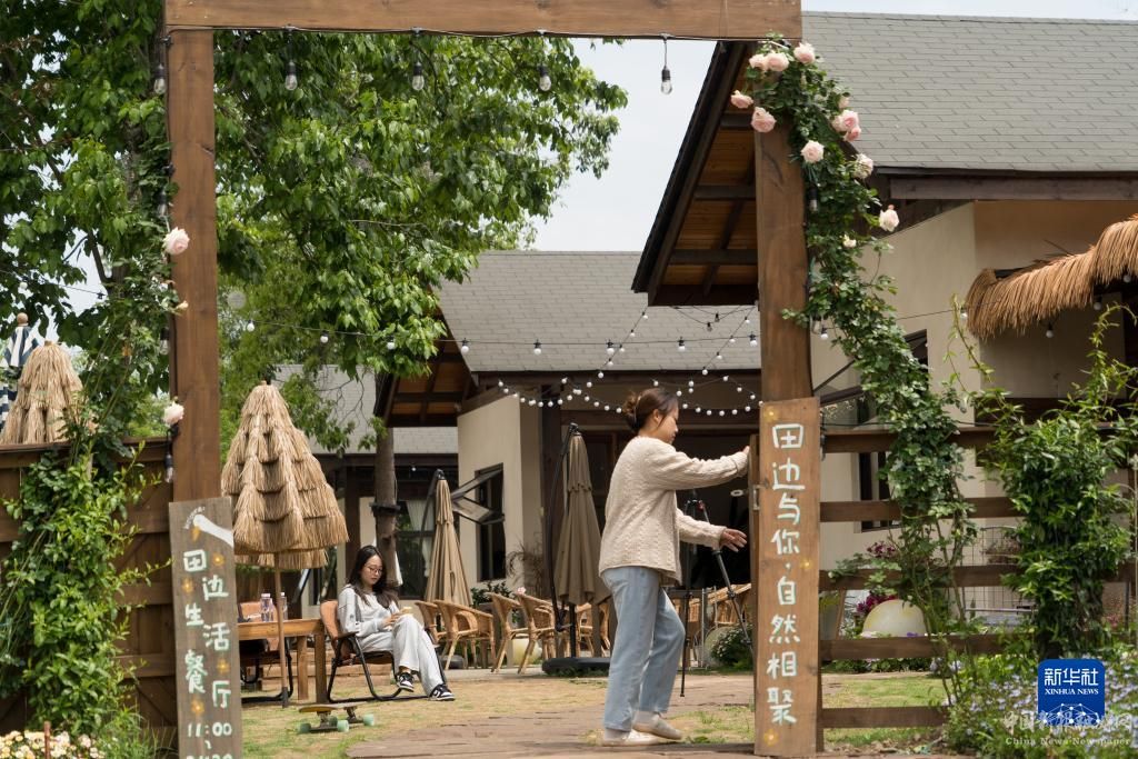 成都市天府新區(qū)官塘村一家田園餐廳的店主(右)打開店門(4月25日攝)。