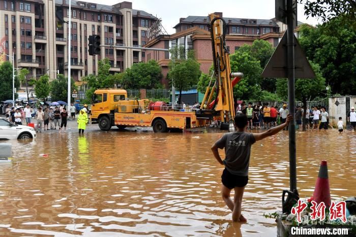 圖為現(xiàn)場(chǎng)排澇車正在作業(yè)。中新社記者 呂明 攝