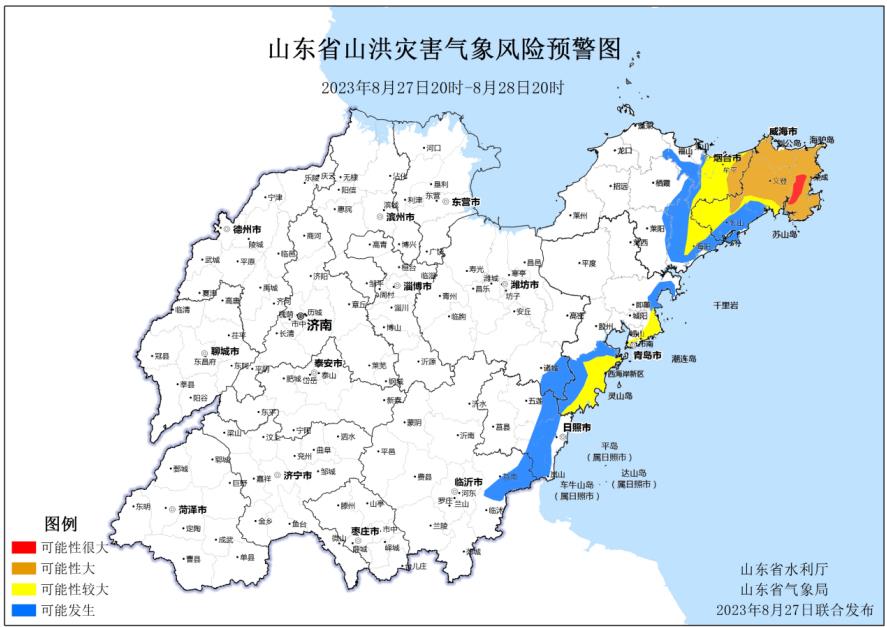 此外,山東省水利廳和山東省氣象局聯(lián)合發(fā)布了山東省山洪災(zāi)害氣象預(yù)警,預(yù)計(jì)8月27日20時(shí)至8月28日20時(shí),威海榮成市中西部地區(qū)發(fā)生山洪災(zāi)害的可能性很大(紅色預(yù)警);威海榮成市大部、文登區(qū)大部、乳山市中北部、環(huán)翠區(qū)和煙臺(tái)牟平區(qū)東部等地發(fā)生山洪災(zāi)害的可能性大(橙色預(yù)警)。此外,威海、煙臺(tái)、青島等市局部地區(qū)發(fā)生山洪災(zāi)害的可能性較大(黃色預(yù)警);威海、煙臺(tái)、青島、濰坊、日照、臨沂等市局部地區(qū)可能發(fā)生山洪災(zāi)害(藍(lán)色預(yù)警),提醒各地注意做好實(shí)時(shí)監(jiān)測(cè)、防汛預(yù)警和轉(zhuǎn)移避險(xiǎn)等防范工作。