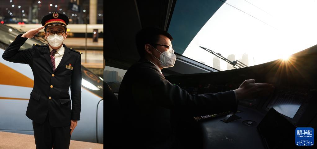 左圖:動(dòng)車組司機(jī)王晗在發(fā)車前留影;右圖:王晗在駕駛動(dòng)車組列車(拼版照片,1月9日攝)。