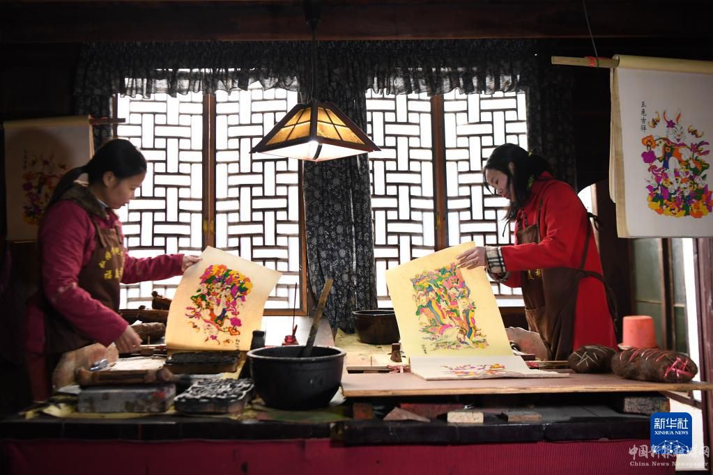 春節(jié)臨近,湖南省邵陽市隆回縣灘頭鎮(zhèn)的木版年畫作坊加班加點趕制年畫,供應(yīng)春節(jié)市場。