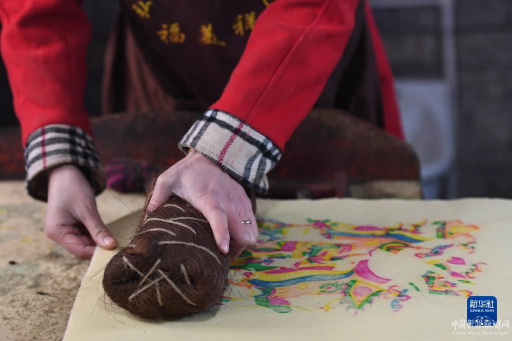 1月17日,在灘頭鎮(zhèn)福美祥年畫作坊,年畫藝人尹冬香在年畫上加入手繪使年畫更加靈動。