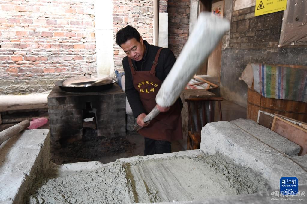 1月17日,在灘頭鎮(zhèn)福美祥年畫作坊,工人在加工天應(yīng)石備用。天應(yīng)石加工成的漿刷在紙上能使年畫上色更加艷麗。