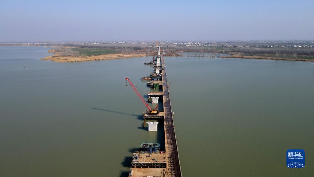 這是2月15日拍攝的合新鐵路安徽段懷洪新河特大橋跨沱湖水中墩施工現(xiàn)場(無人機照片)。