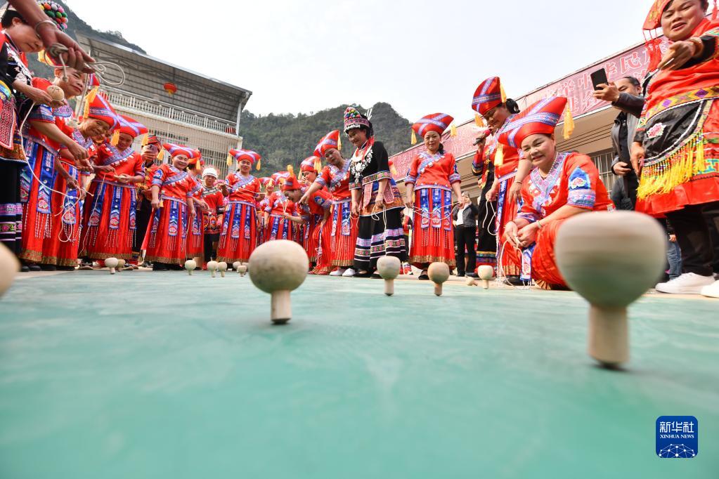 當日,廣西大化瑤族自治縣大化鎮(zhèn)仁良村舉辦“三八”國際婦女節(jié)陀螺比賽,壯、瑤、漢等各族婦女歡聚一堂,通過打陀螺、跳竹竿舞、品長桌宴等豐富多彩的民俗體育和文化活動,迎接節(jié)日。