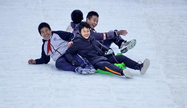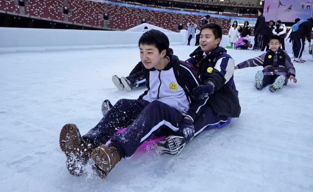 12月29日,學生們在“鳥巢”歡樂冰雪季上玩耍。新華社記者 李欣 攝