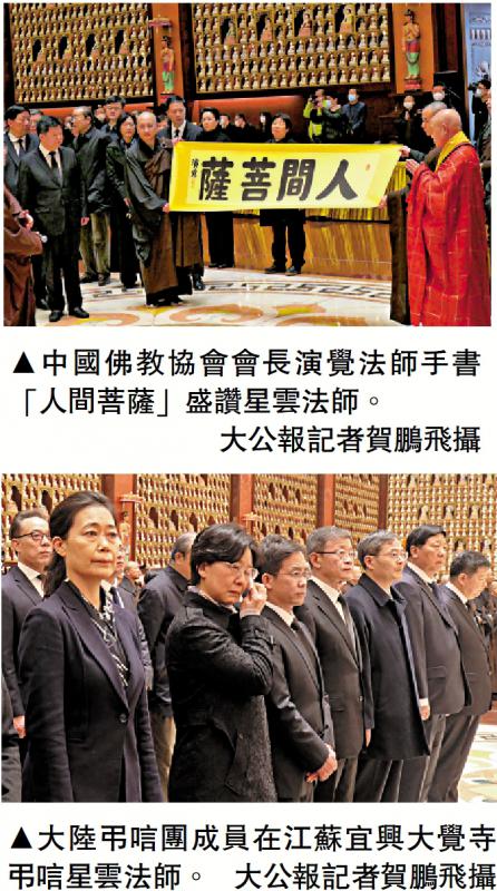 上圖:中國佛教協(xié)會會長演覺法師手書“人間菩薩”盛贊星云法師。下圖:大陸吊唁團(tuán)成員在江蘇宜興大覺寺吊唁星云法師。\大公報記者賀鵬飛攝