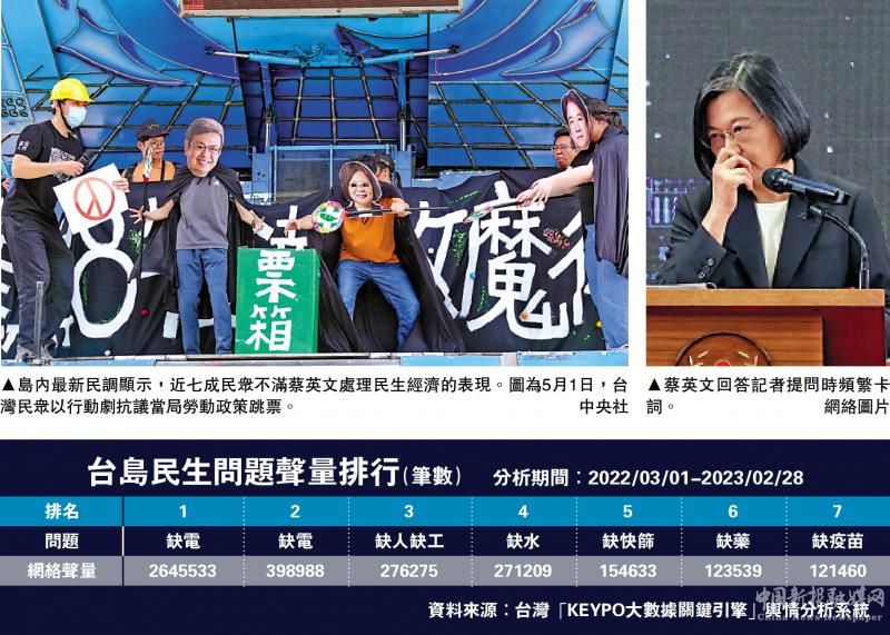 圖:(左)島內(nèi)最新民調(diào)顯示,近七成民眾不滿蔡英文處理民生經(jīng)濟的表現(xiàn)。圖為5月1日,臺灣民眾以行動劇抗議當局勞動政策跳票。\中央社  圖:(右)蔡英文回答記者提問時頻繁卡詞。\網(wǎng)絡(luò)圖片
