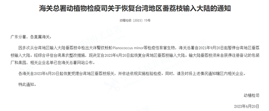 6月20日,動植檢司發(fā)布了《海關(guān)總署動植物檢疫司關(guān)于恢復(fù)臺灣地區(qū)番荔枝輸入大陸的通知》。內(nèi)容如下: