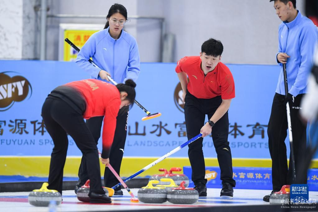 1月8日,國家集訓(xùn)隊(duì)隊(duì)員許鑫(右二)在比賽中向隊(duì)友示意冰壺走向。最終,國家集訓(xùn)隊(duì)以8比3戰(zhàn)勝吉林隊(duì)。新華社記者 吳剛 攝