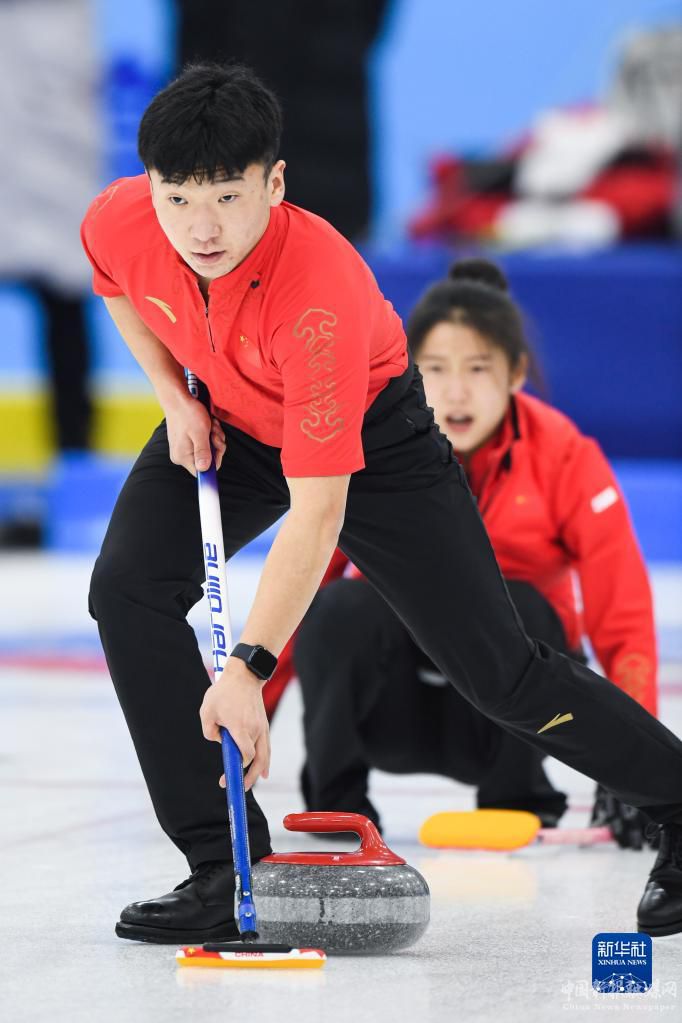 1月8日,天津隊(duì)隊(duì)員錢志鵬在比賽中擲壺。最終,天津隊(duì)以6比4戰(zhàn)勝上海隊(duì)。新華社記者 吳剛 攝