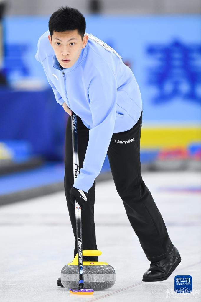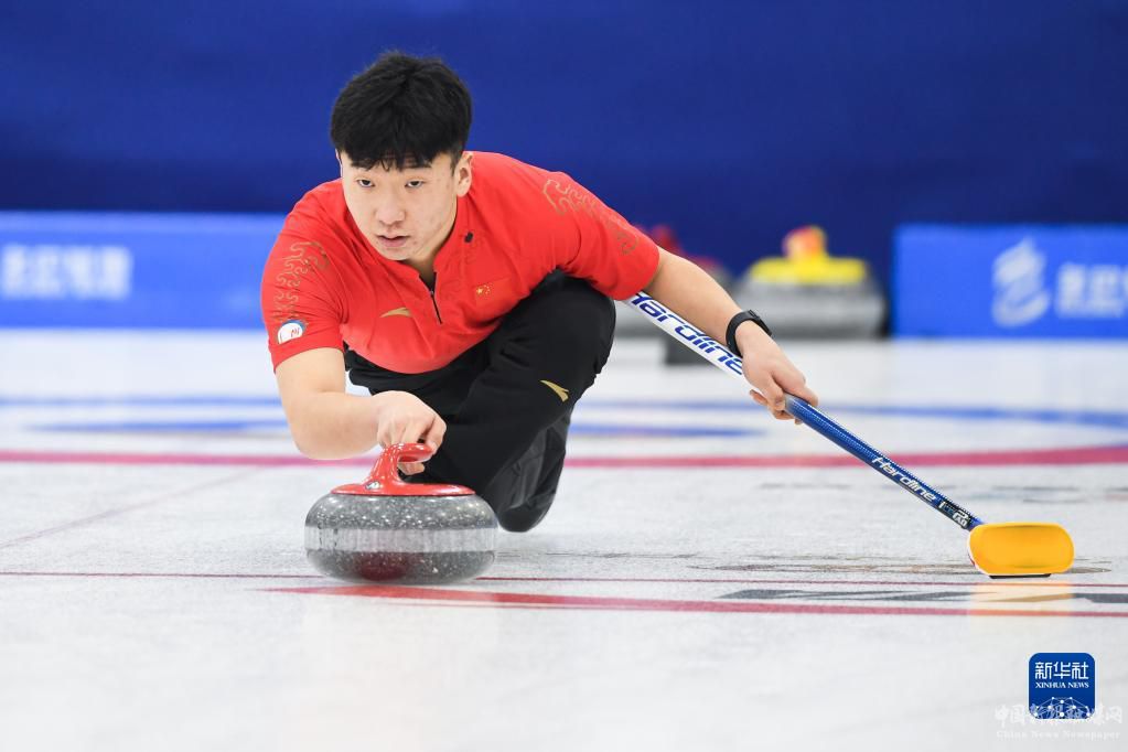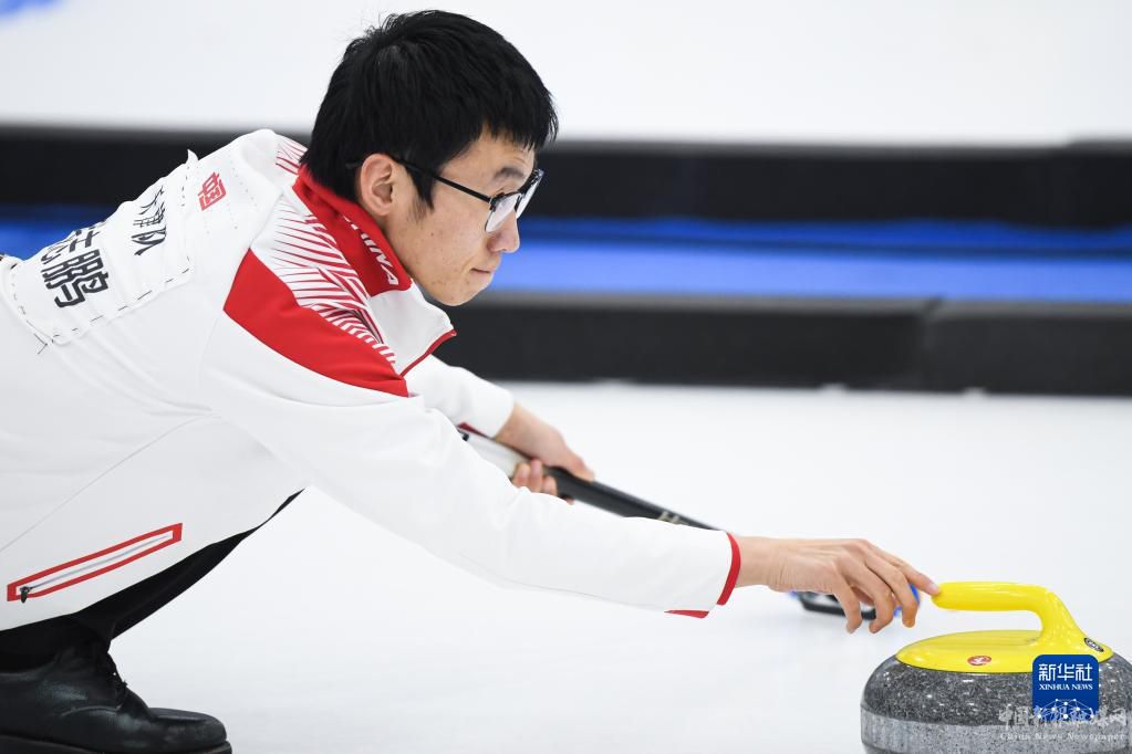 1月8日,國家集訓(xùn)隊(duì)隊(duì)員許鑫在比賽中擲壺。最終,國家集訓(xùn)隊(duì)以8比3戰(zhàn)勝吉林隊(duì)。新華社記者 吳剛 攝