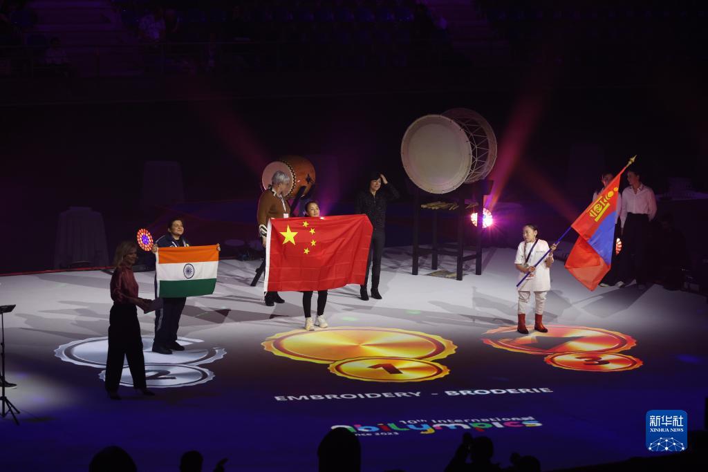 3月25日,在法國梅斯舉行的第十屆國際殘疾人職業(yè)技能競賽中,在刺繡比賽中奪冠的中國選手布云秀上臺領(lǐng)獎。