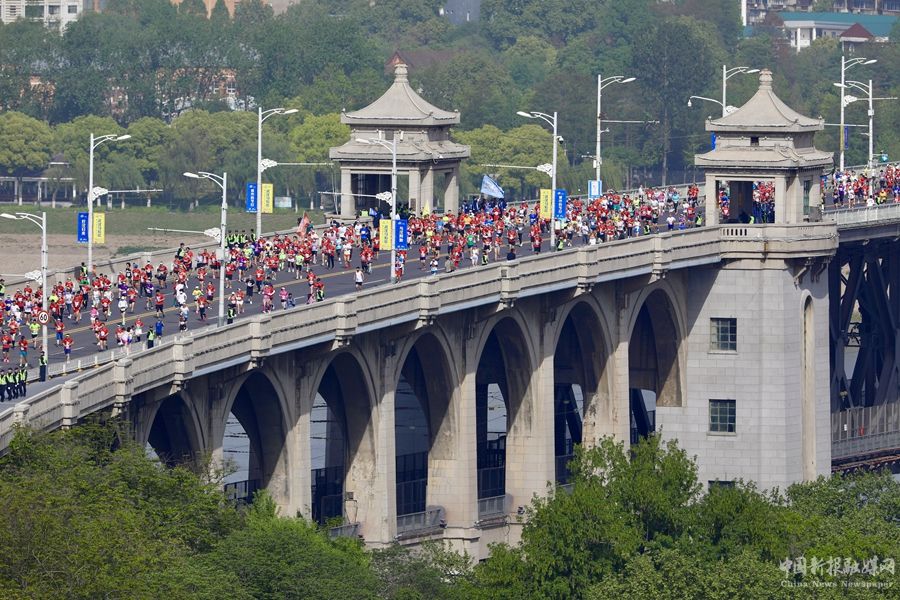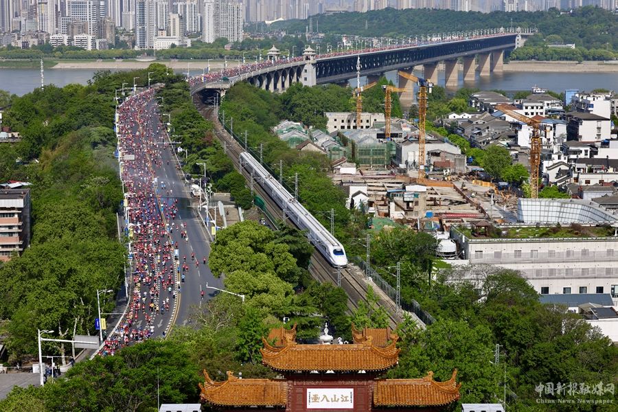 4月16日,參賽選手經(jīng)過武漢長江大橋。 中國日報記者 朱興鑫 攝