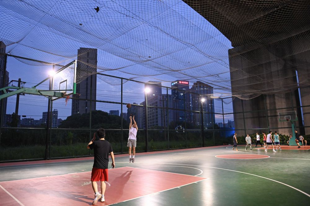 2022年9月20日,市民在位于高鐵橋下的錢(qián)江世紀(jì)城體育公園打籃球。在杭州,一批運(yùn)動(dòng)場(chǎng)館見(jiàn)縫插針地“嵌入”市民生活圈,城市空間的“邊角余料”正成為全民健身的“金角銀邊”。新華社記者 黃宗治 攝