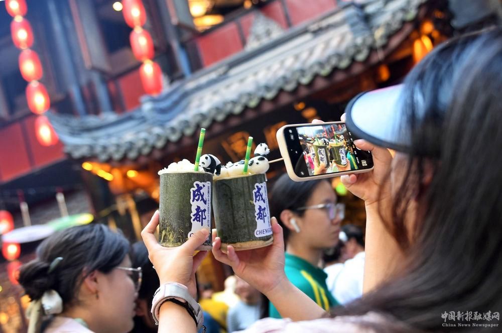 7月14日,兩名游客在成都錦里用手機(jī)拍攝剛剛購(gòu)買(mǎi)的特色飲品。新華社記者 劉坤 攝