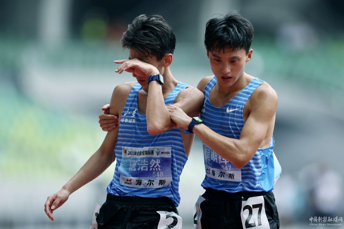 山東選手唐浩然(左)與吳朝輝在男子萬米決賽后離場。中國日報記者 魏曉昊 攝