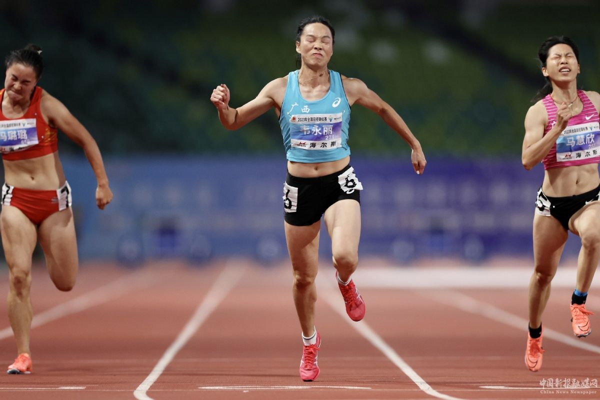 廣西選手韋永麗(中)奪得女子100米冠軍。中國日報記者 魏曉昊 攝