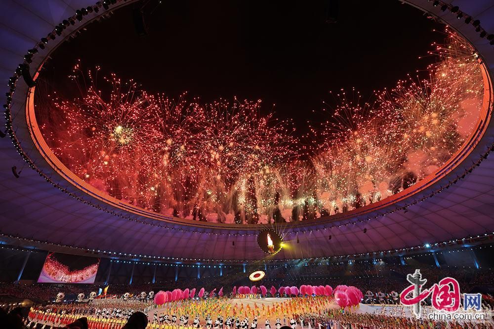 7月28日,第三十一屆世界大學(xué)生夏季運動會開幕式現(xiàn)場,大運會火炬點燃后場內(nèi)煙花綻放。中國網(wǎng) 倫曉璇攝影
