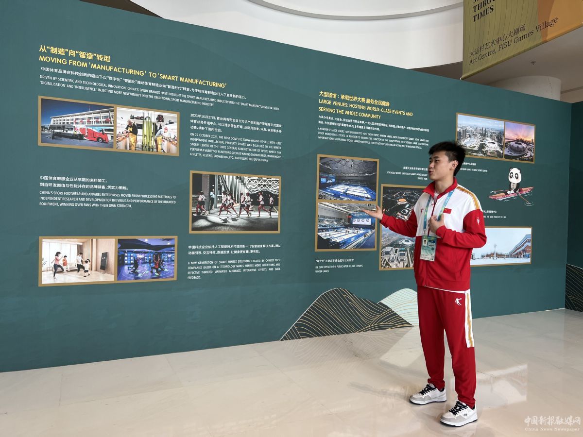 7月31日,剛剛在成都大運(yùn)會(huì)男子50米步槍三姿團(tuán)體比賽中奪得金牌的劉宇坤來到展廳參觀交流,有了不一樣的感受。此刻,他對(duì)中華體育精神有了更深刻的理解:“每一名運(yùn)動(dòng)員在賽場上的勝利,背后是祖國的發(fā)展和強(qiáng)大,有人民的支持和期待,這些都激勵(lì)我們不斷奮勇前進(jìn),讓中華體育精神繼續(xù)發(fā)揚(yáng)光大。”