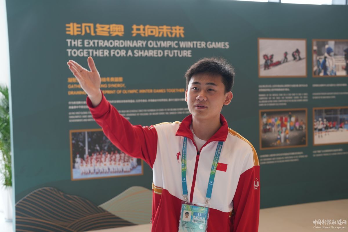 在成都大運(yùn)村藝術(shù)中心2層,中國大學(xué)生射擊隊(duì)隊(duì)員劉宇坤正向來往觀眾介紹中國體育的光榮發(fā)展史。說到中國射擊隊(duì)前輩許海峰的拼搏事跡時(shí),他激動(dòng)不已。