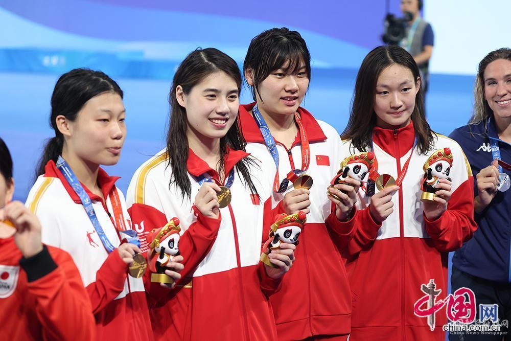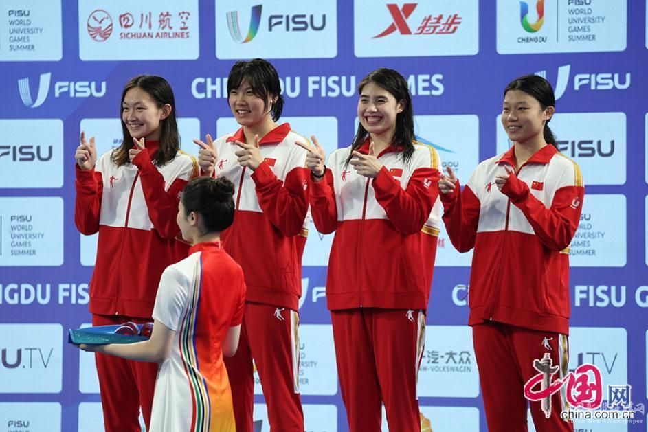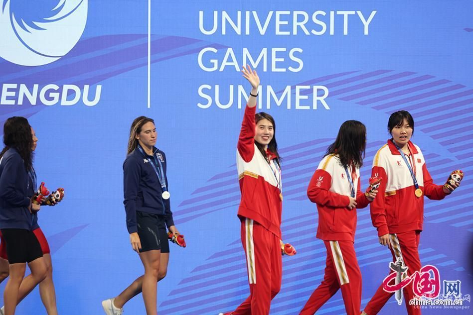 8月1日,成都大運(yùn)會(huì)女子4×100米自由泳接力決賽舉行,賽后頒獎(jiǎng)儀式上,中國選手合影。中國網(wǎng)記者 倫曉璇 攝
