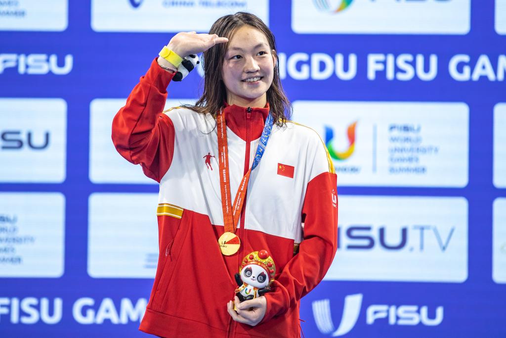 8月4日,李冰潔在頒獎儀式上。當(dāng)日,在成都舉行的第31屆世界大學(xué)生夏季運(yùn)動會女子1500米自由泳決賽中,中國選手李冰潔以16分18秒48的成績獲得冠軍。新華社記者 黃偉 攝
