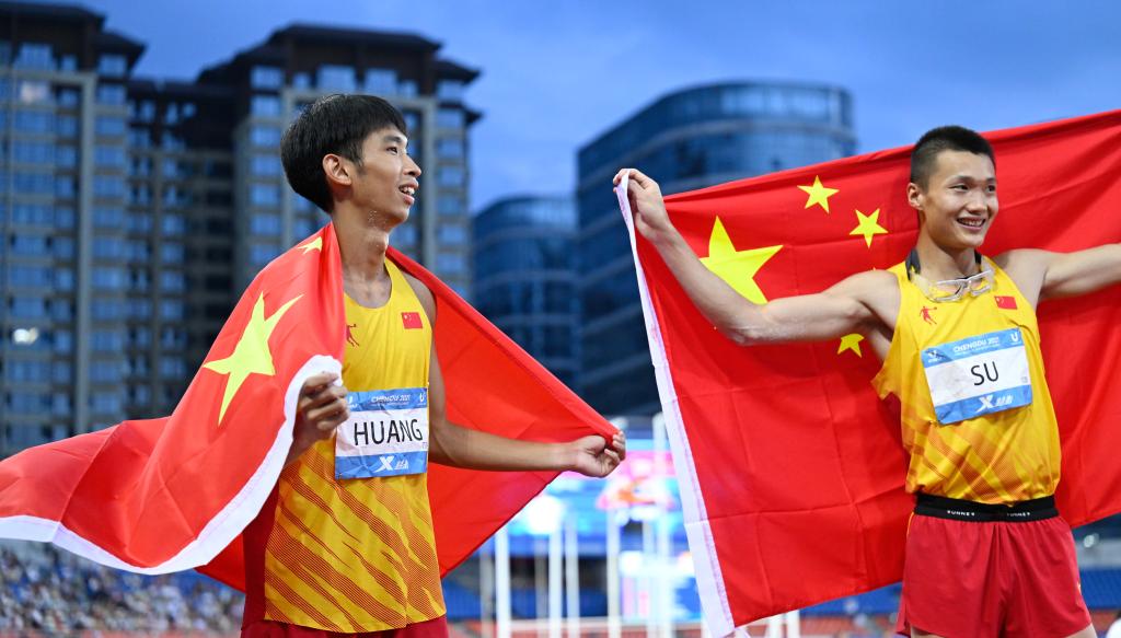 8月3日,中國選手黃華鋒(左)和粟文在成都第31屆世界大學(xué)生夏季運(yùn)動會田徑項(xiàng)目男子三級跳遠(yuǎn)決賽后慶祝。黃華鋒以16米76的成績獲得季軍。新華社記者 鄧華 攝