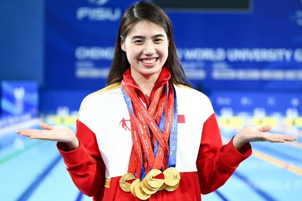 8月7日,張雨霏展示她獲得的九枚大運(yùn)會(huì)金牌。新華社記者 吳剛 攝