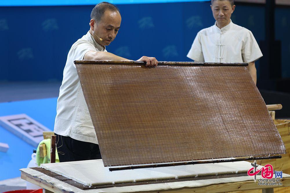 9月16日,第二屆全國技能大賽在天津開賽。圖為在第二屆全國技能大賽絕技展演活動(dòng)現(xiàn)場(chǎng),宣紙撈紙工人周東紅(左)展示宣紙撈紙技藝。中國網(wǎng)記者 倫曉璇 攝
