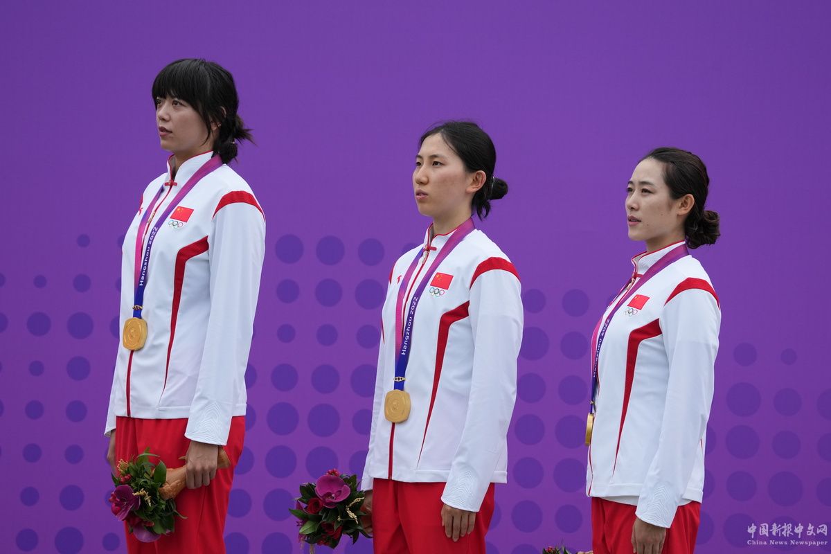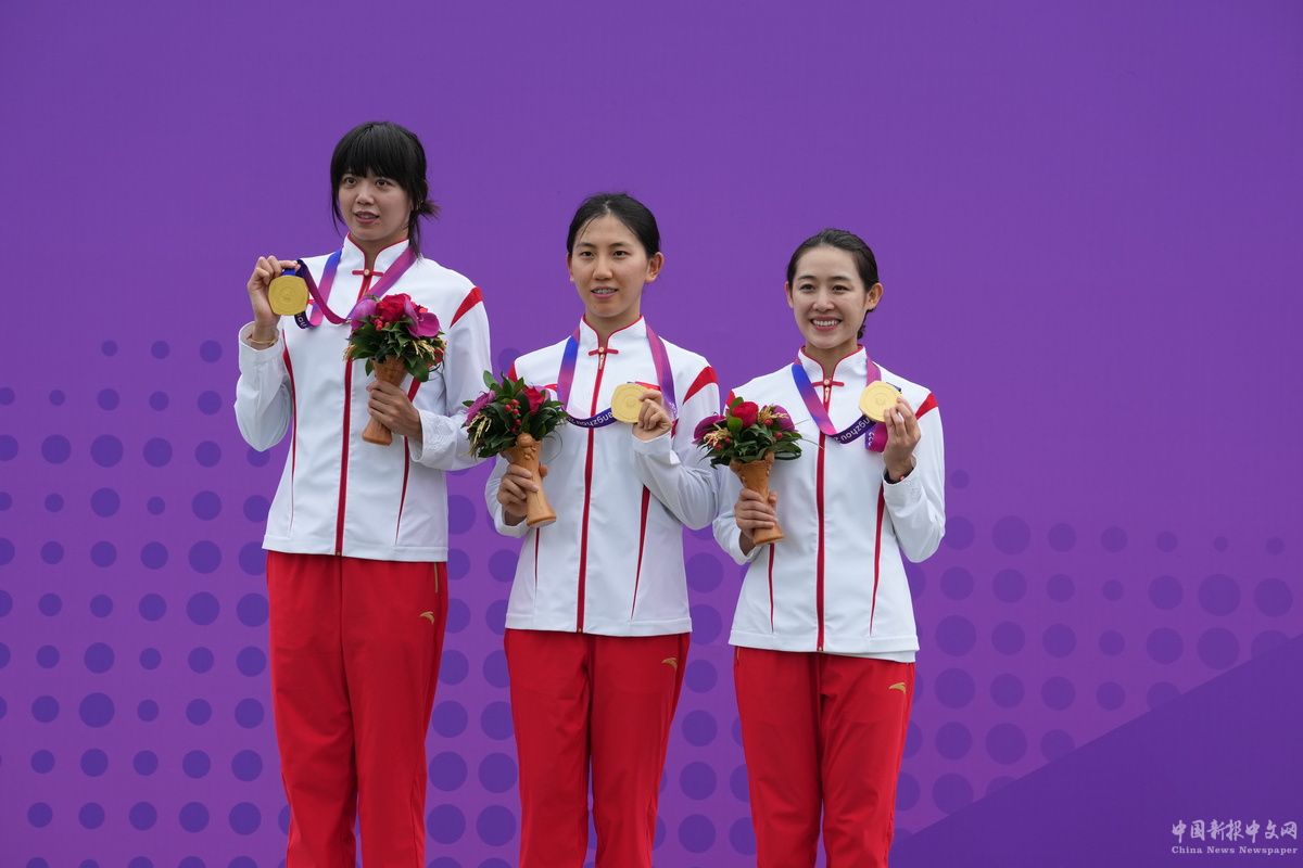 9月24日,獲得金牌的中國隊(duì)選手邊雨霏(左)、張明煜(中)、鐘秀婷在女子團(tuán)體決賽頒獎(jiǎng)儀式上。中國日報(bào)記者 高爾強(qiáng) 攝