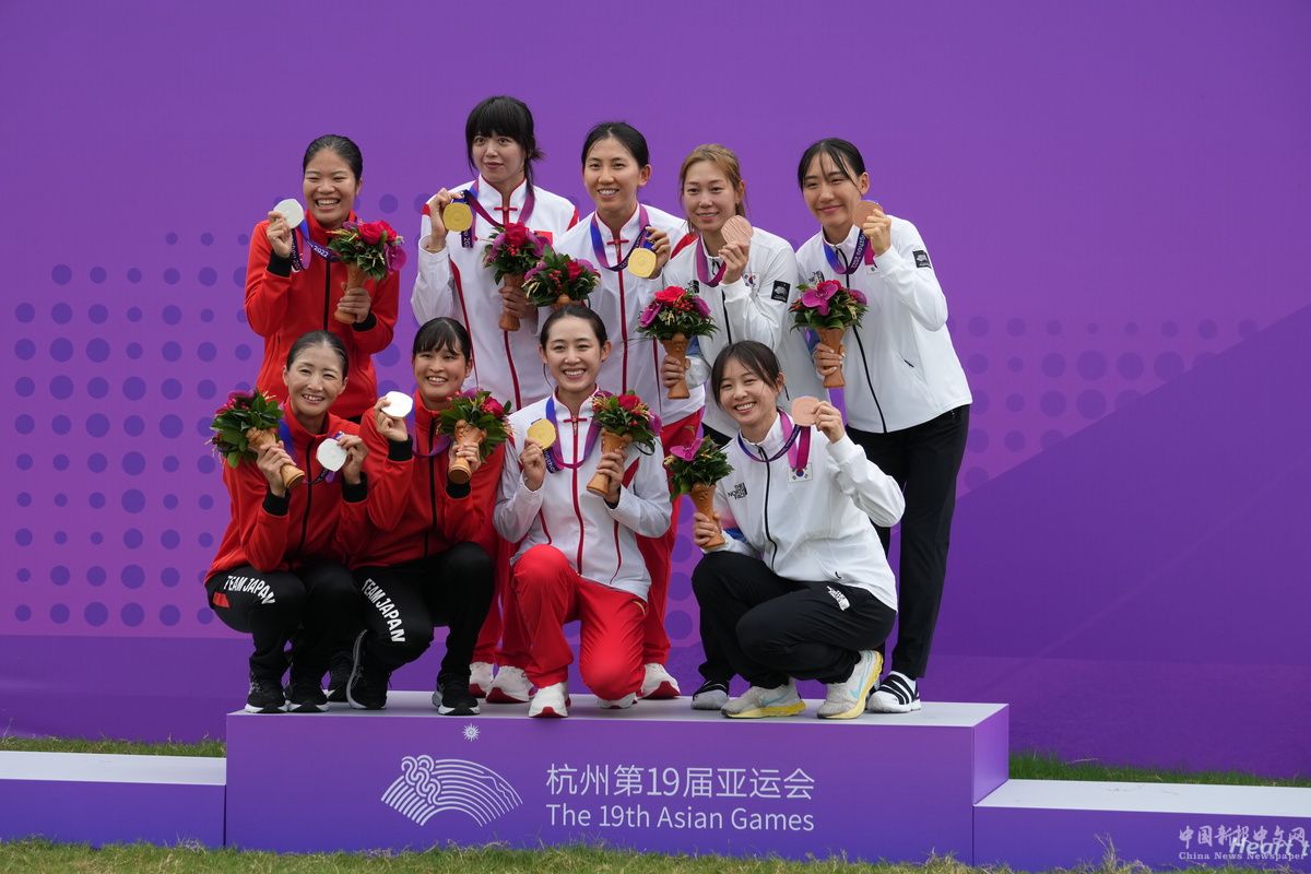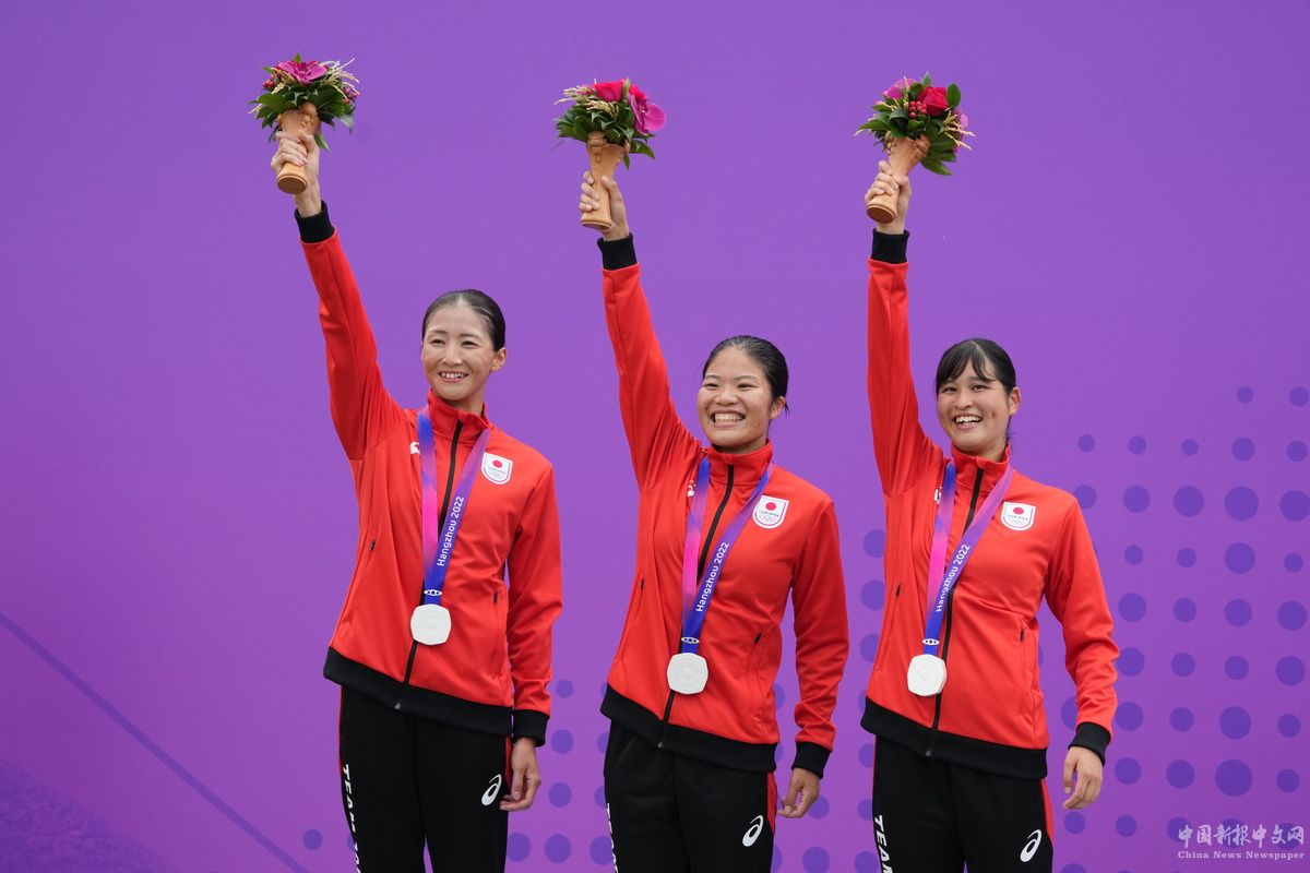 9月24日,獲得銀牌的日本隊(duì)選手內(nèi)田美咲(左)、梅村華苗(中)、柴田華在女子團(tuán)體決賽頒獎(jiǎng)儀式上。中國日報(bào)記者 高爾強(qiáng) 攝