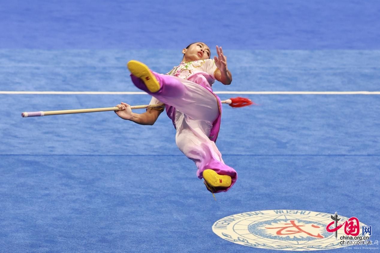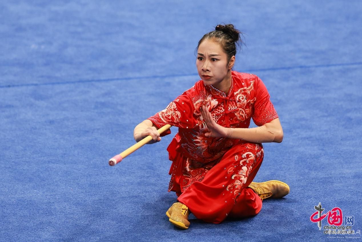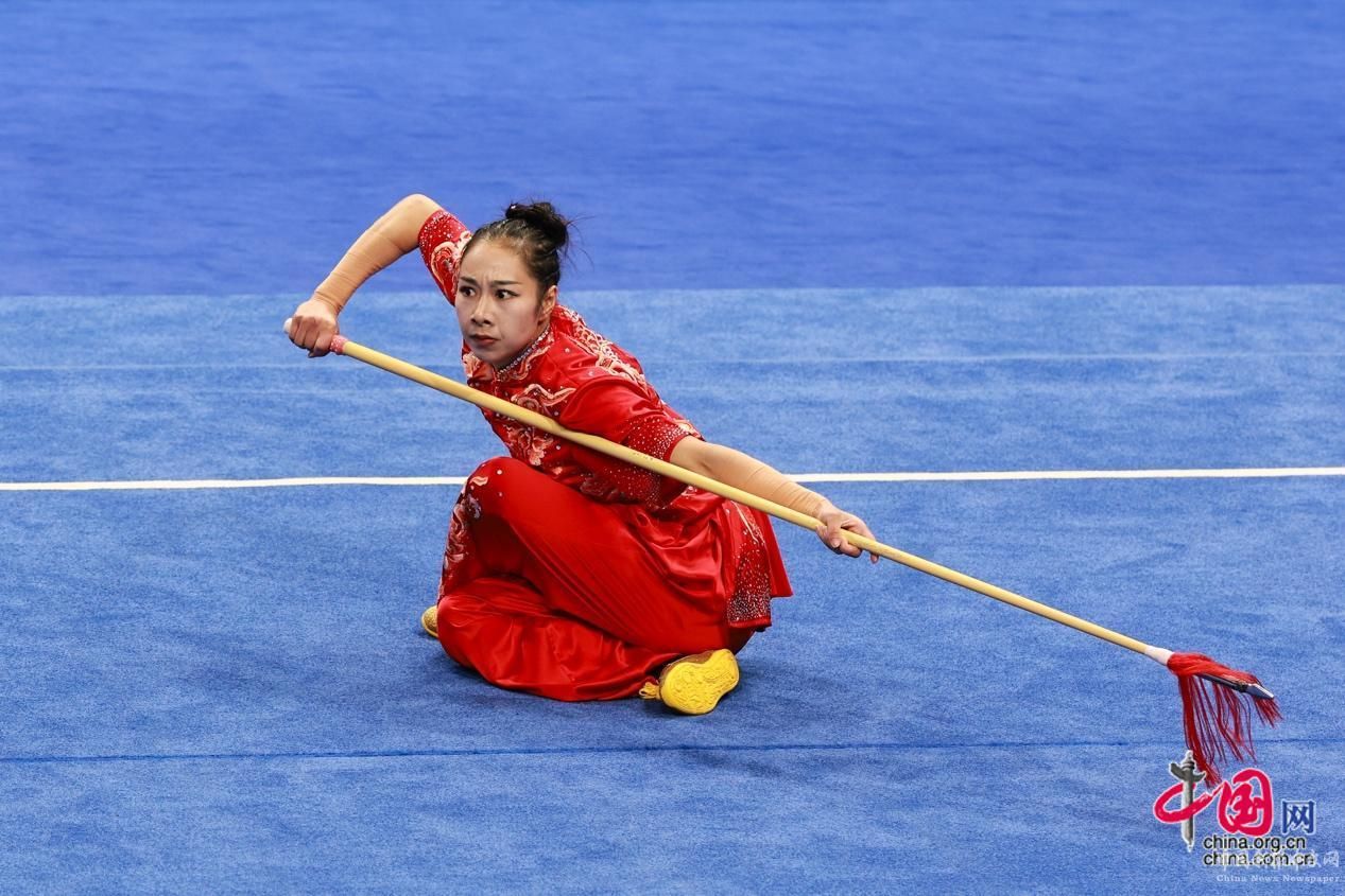 9月27日,杭州第19屆亞運(yùn)會武術(shù)女子劍術(shù)槍術(shù)全能決賽在蕭山瓜瀝文化體育中心舉行,中國選手賴曉曉19.6分的優(yōu)異成績摘取桂冠。圖為槍術(shù)決賽現(xiàn)場。中國網(wǎng)記者 董寧 攝影